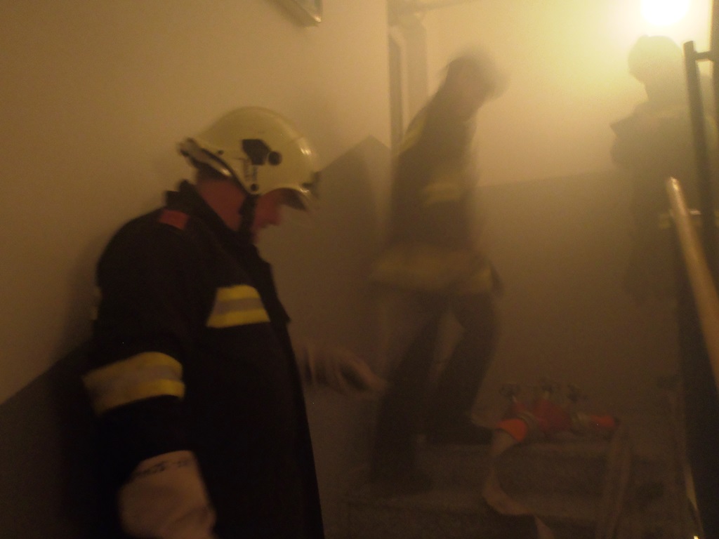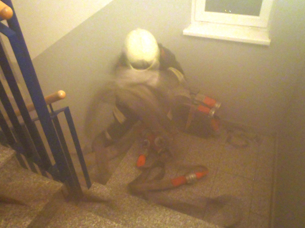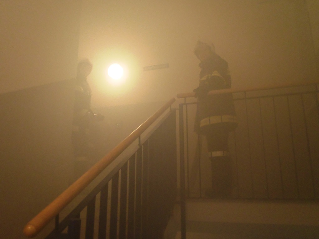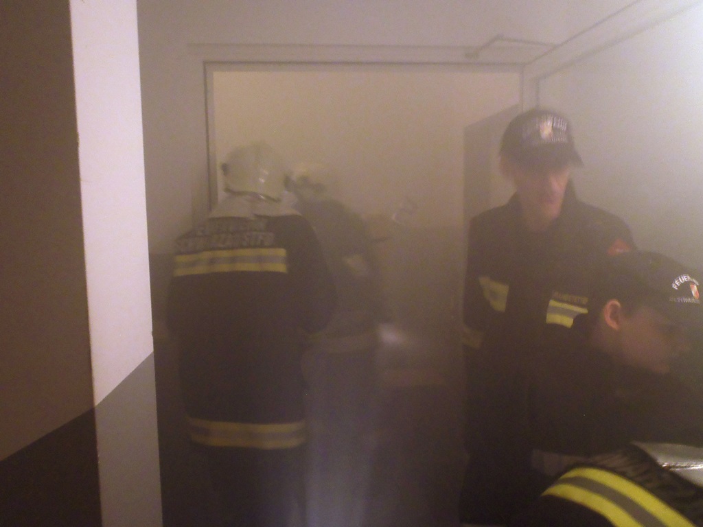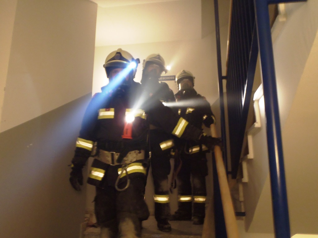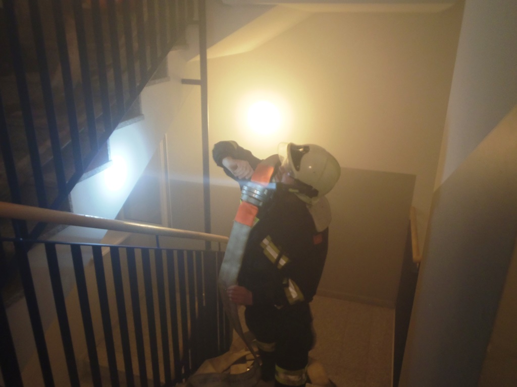 Als erstes wurden 3 Kameraden mit Atemschutz ins den Wohnblock geschickt um die 3 Kinder zu suchen. Die restliche Besatzung legte bis vor dem Brandabschnitt eine B-Leitung. Von dort ging es mit einer C-Leitung weiter zum Brandherd.