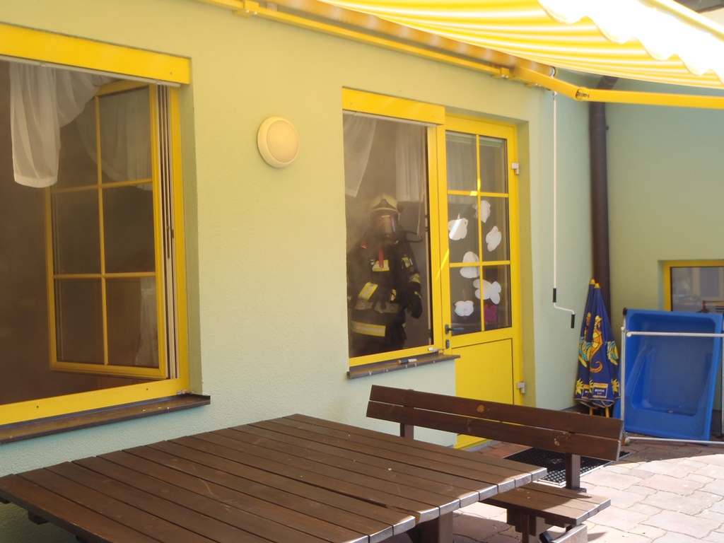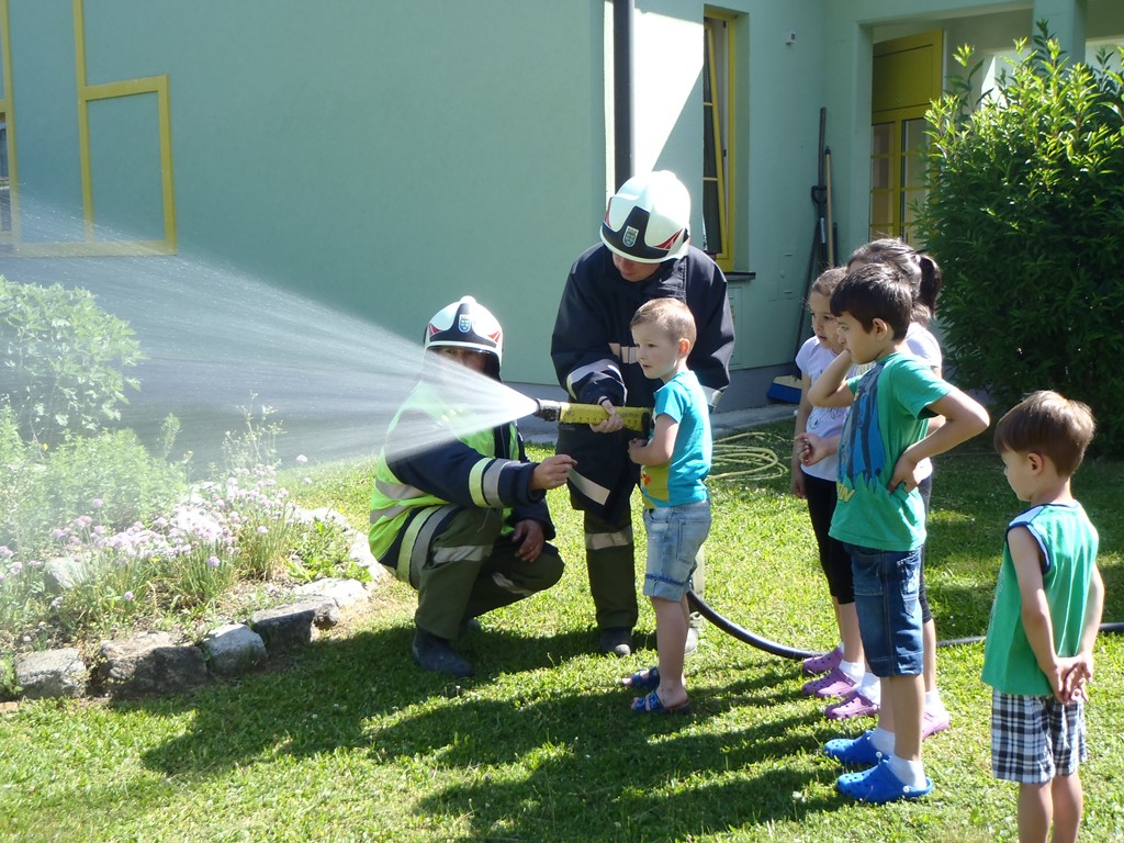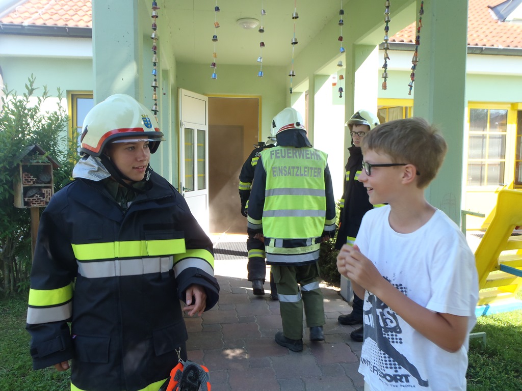 Mit zwei Atemschutztrupps, bestehend aus Föhrenau und Schwarzau, wurden die Räume, durchsucht und die vermissten Personen gerettet. Im Anschluss durften die Kindergartenkinder noch mit dem Hochdruckrohr