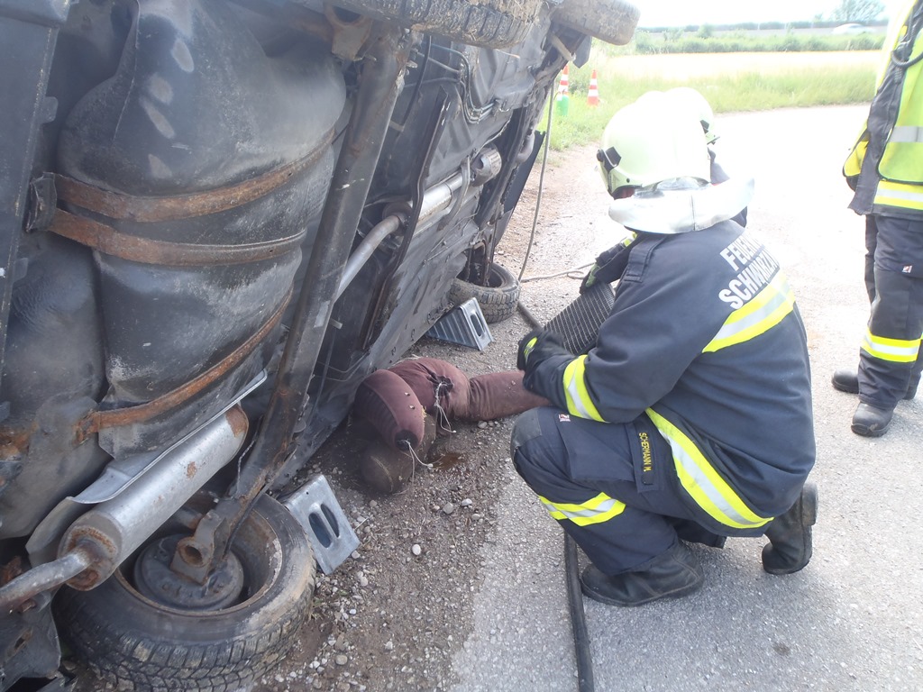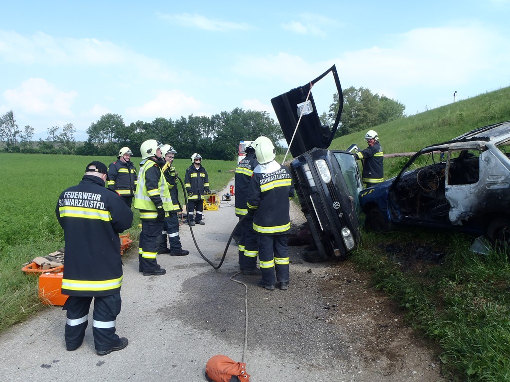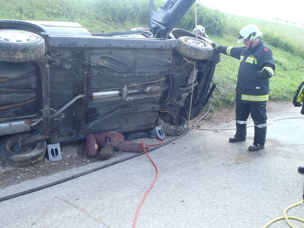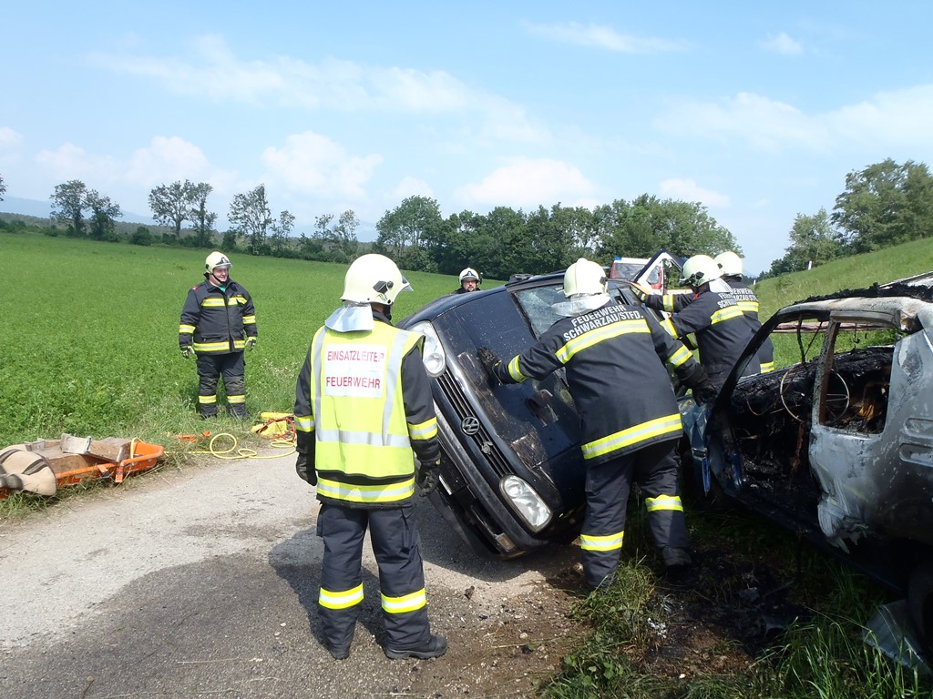 Neben dem Löschen des Fahrzeuges das in Vollbrand stand, wurde das zweite Fahrzeug, das auf der Seite lag, gesichert. Die verletzte Person die im Fahrzeug war, wurde mit dem Hydraulischen Rettungsgerät gerettet.