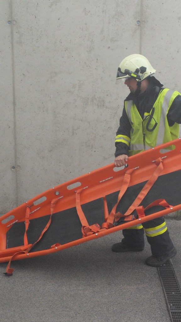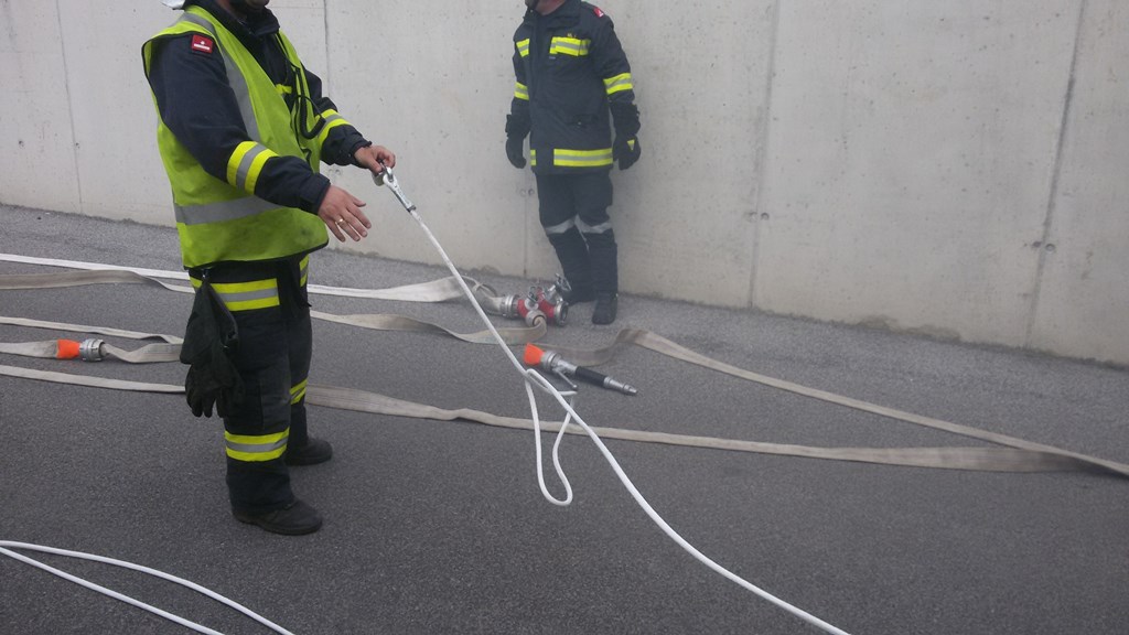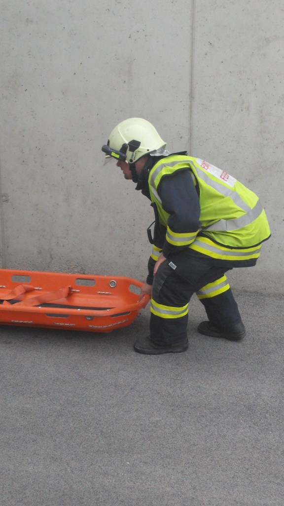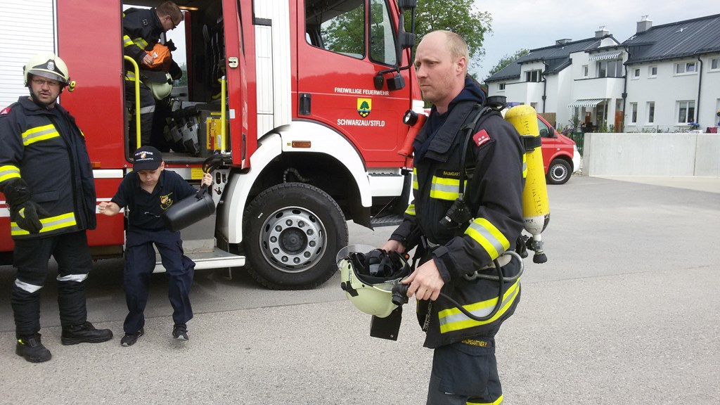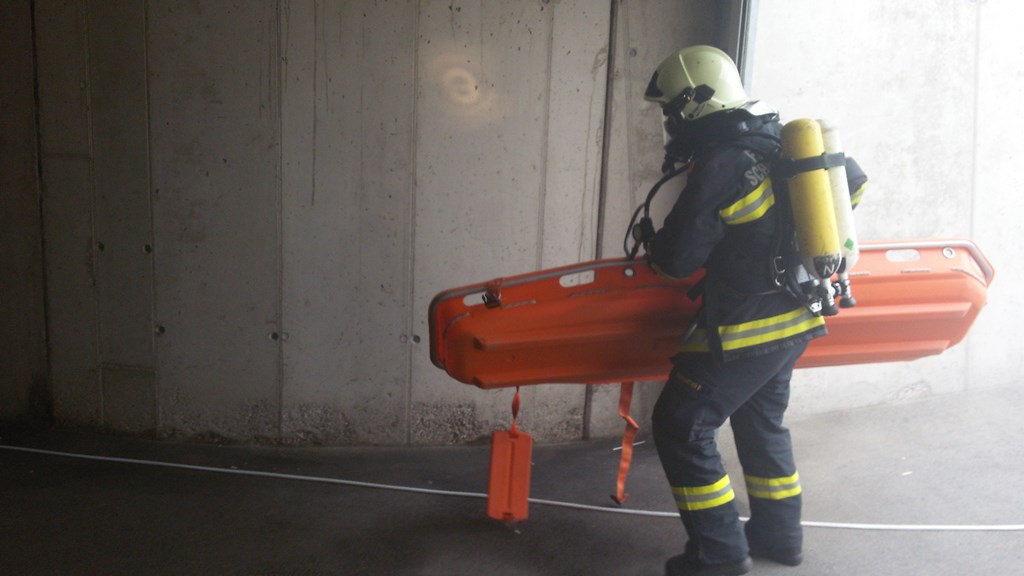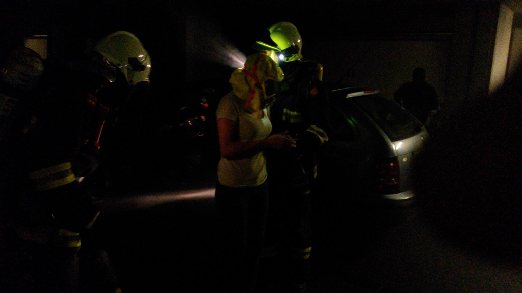 Mit schwerem Atemschutz wurde die Frau aus ihrem PKW mit Hilfe einer Fluchthaube evakuiert. Eines der Kinder wurde über das Stiegenhaus ins Freie gebracht, das andere wurde mit der Korbtrage aus der Garage transportiert. |