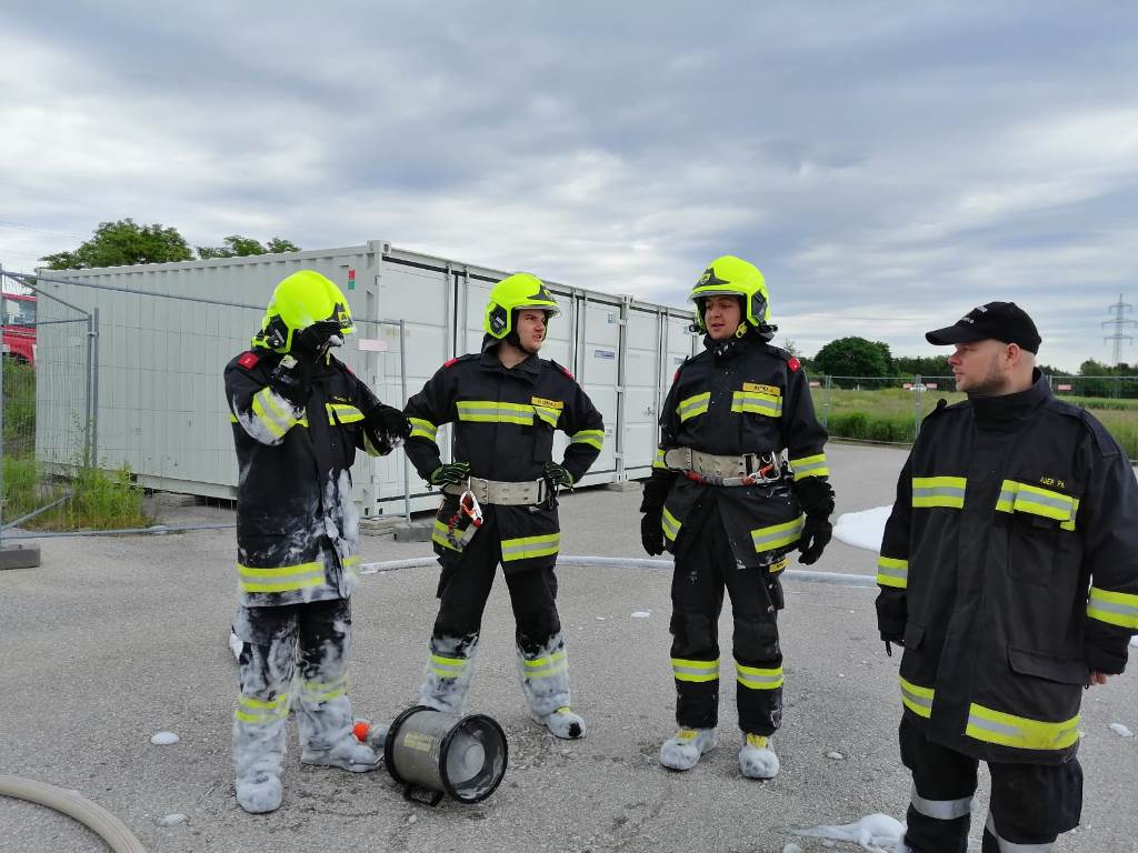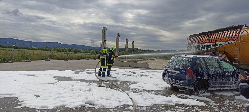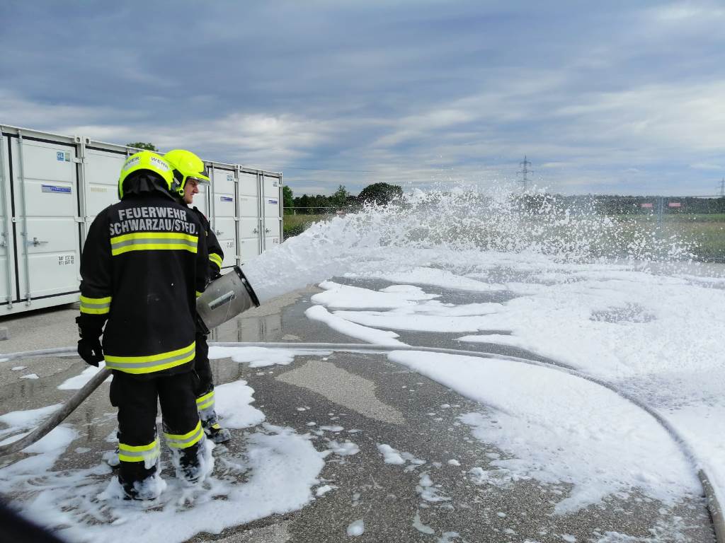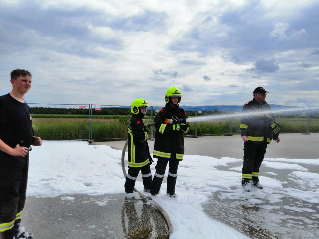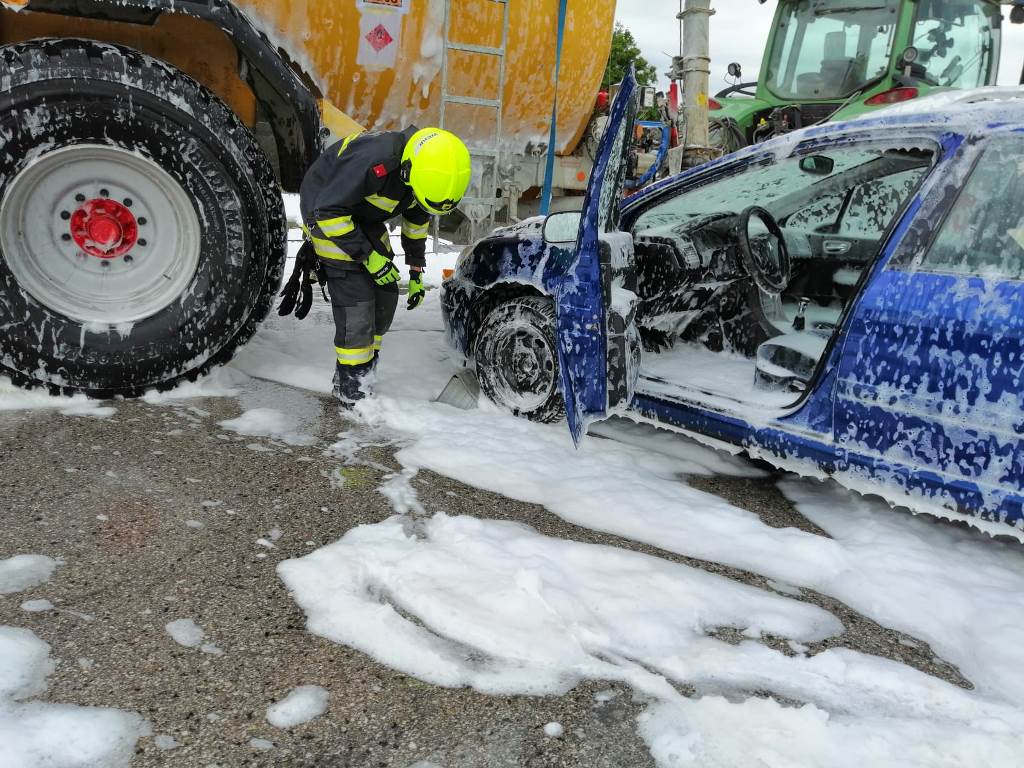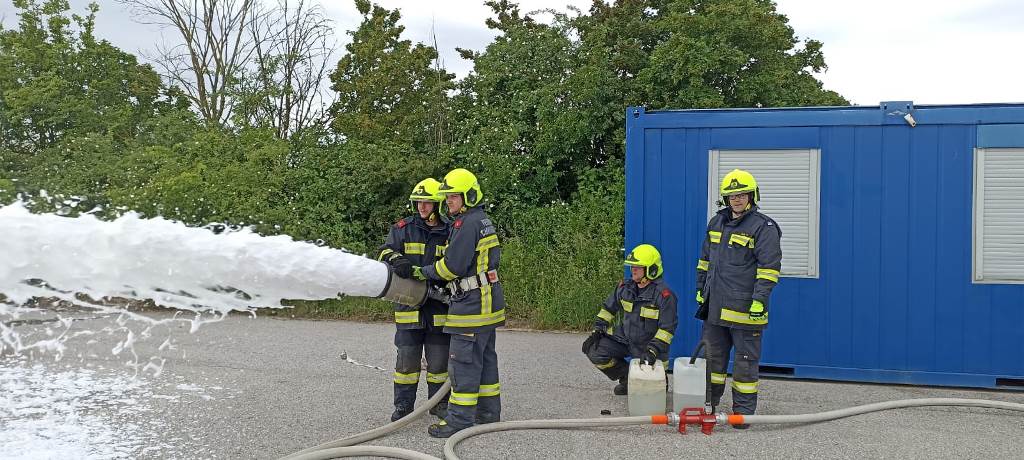 Am Übungsort angekommen, machte sich der Einsatzleiter ein Lagebild. Da es bei den verunglückten Fahrzeugen brannte, veranlasste der Einsatzleiter die Mannschaft, einen Schaumangriff durchzuführen.