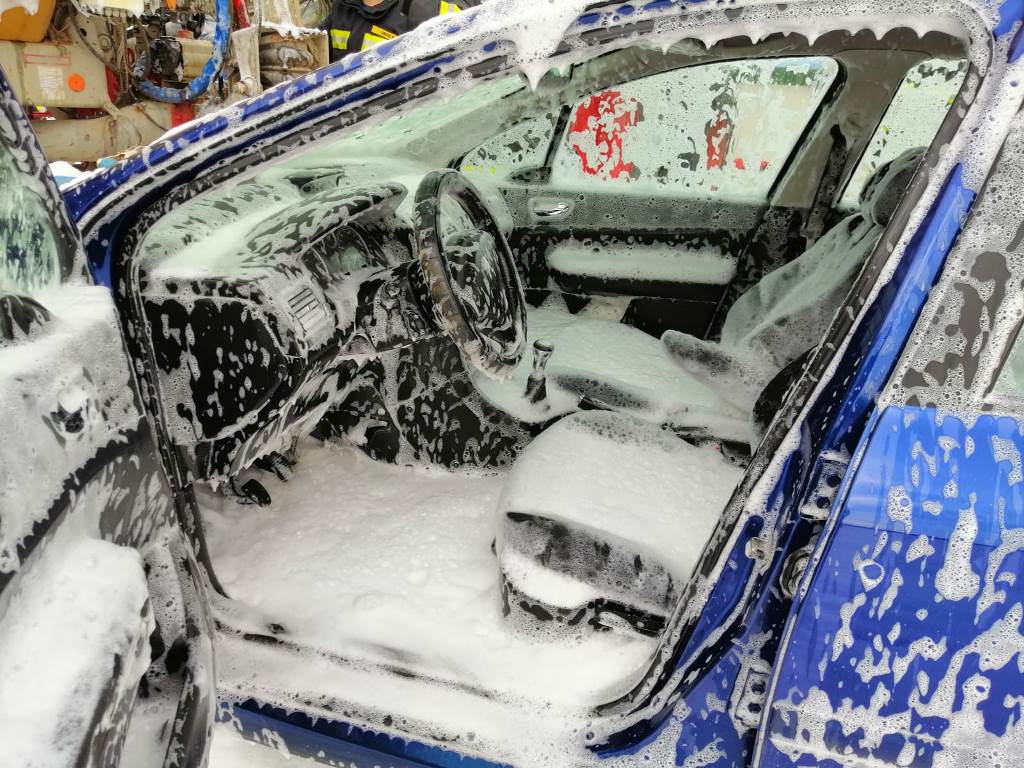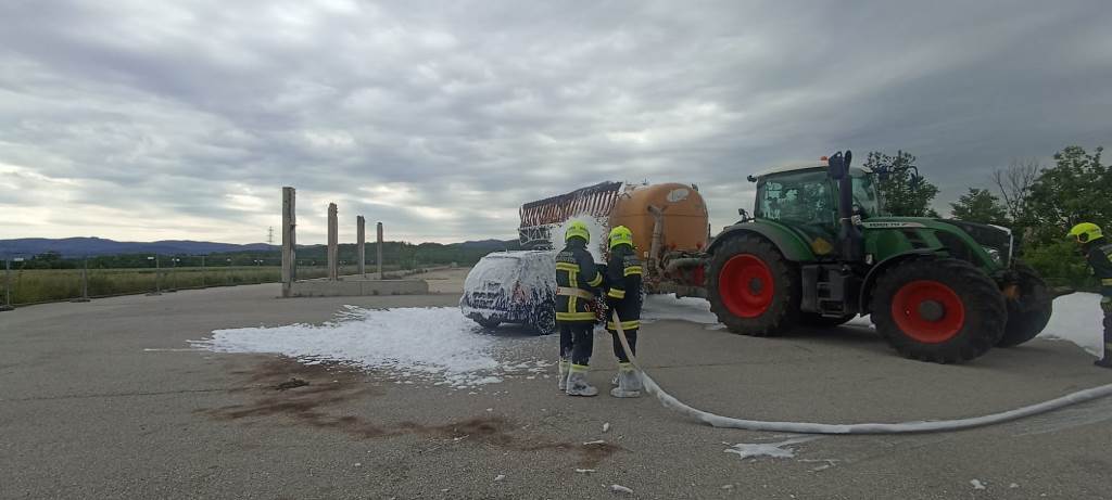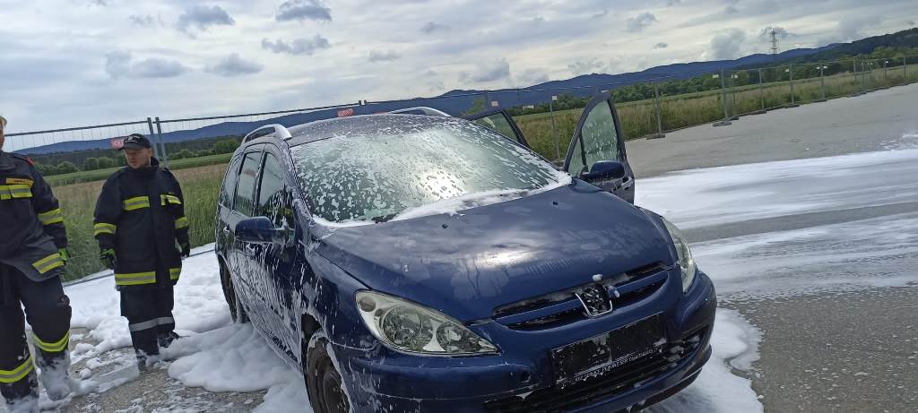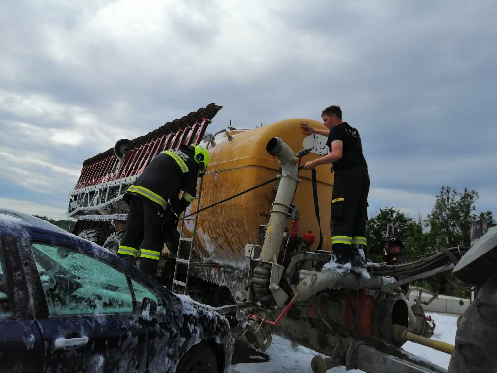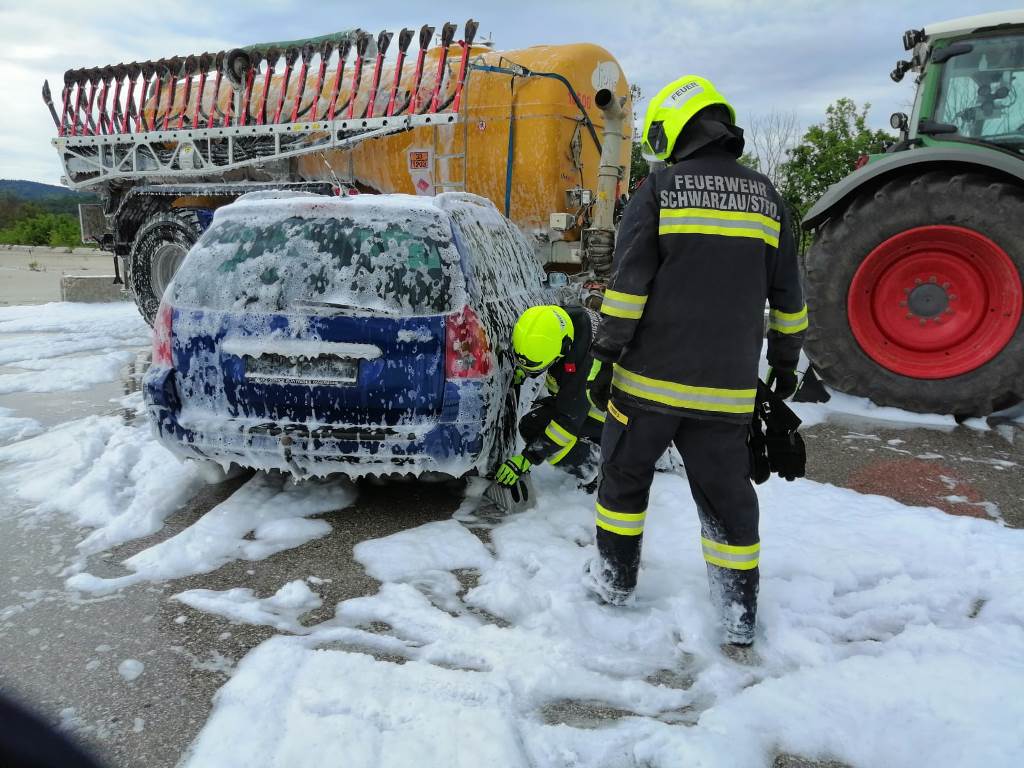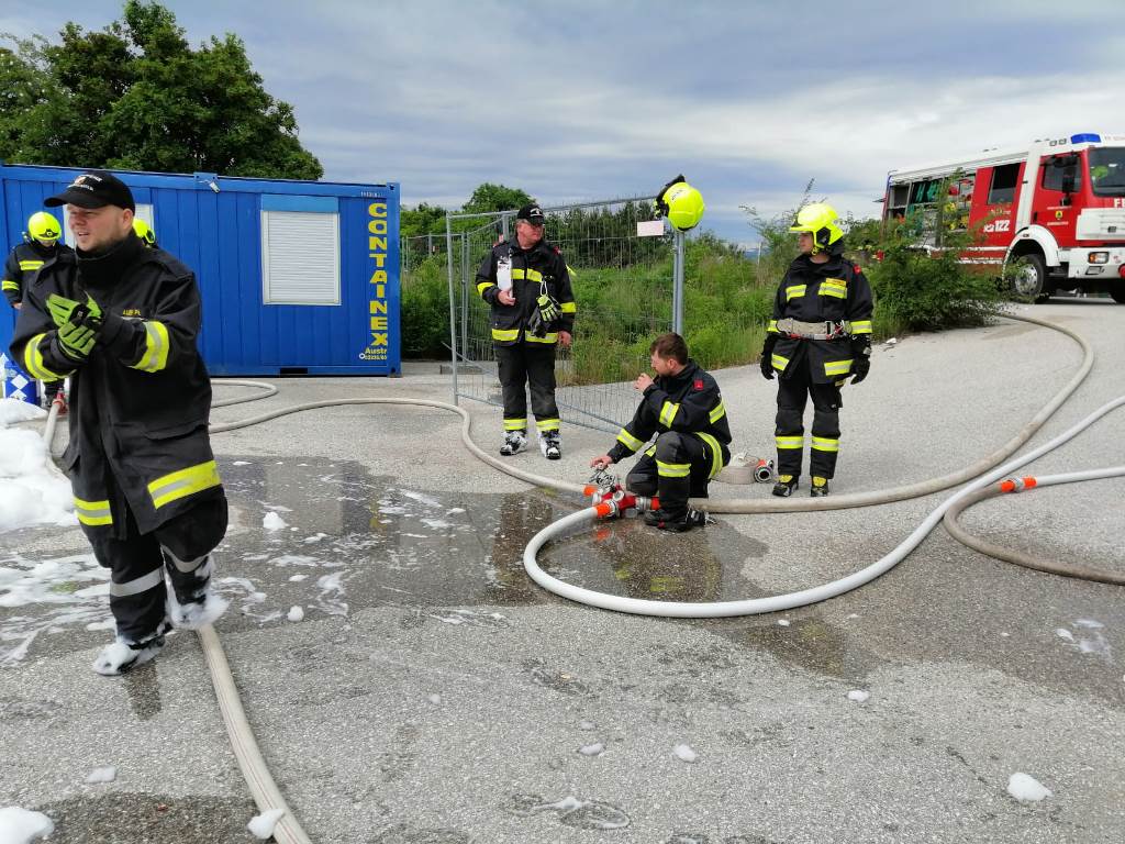 Am Übungsort angekommen, machte sich der Einsatzleiter ein Lagebild. Da es bei den verunglückten Fahrzeugen brannte, veranlasste der Einsatzleiter die Mannschaft, einen Schaumangriff durchzuführen.