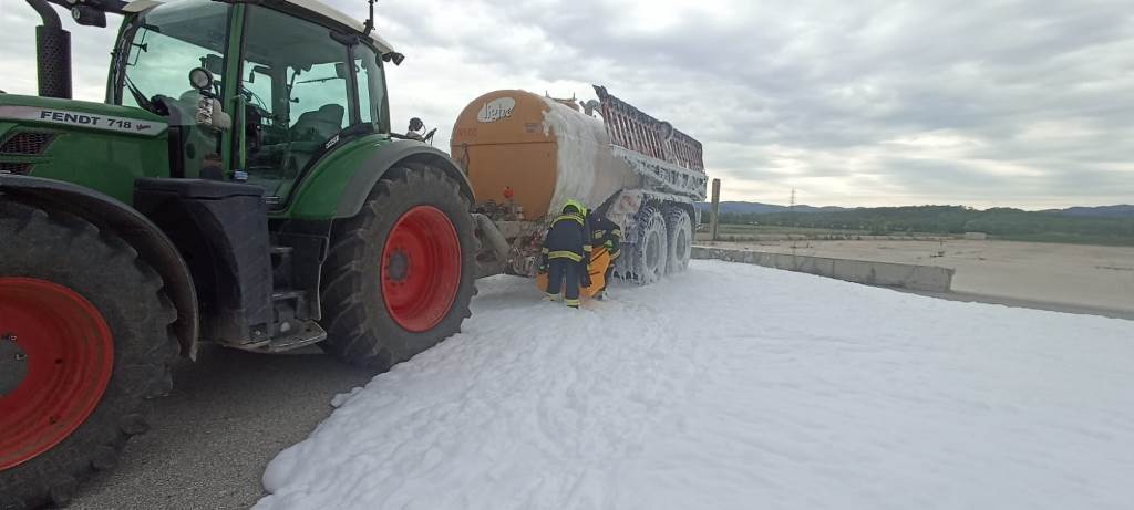Nach dem erfolgreichen Löschen des Brandes, wurde unter dem Tank eine Ölauffangwanne untergestellt und die undichte Stelle mit Spanngurten abgedichtet.