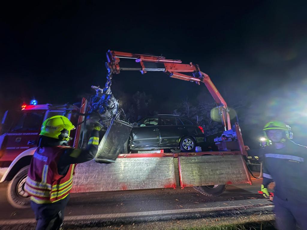 Die FF Schwarzau/Stfld. verbrachte das Auto und den Motor mit dem Kran auf einen sicheren Abstellplatz.