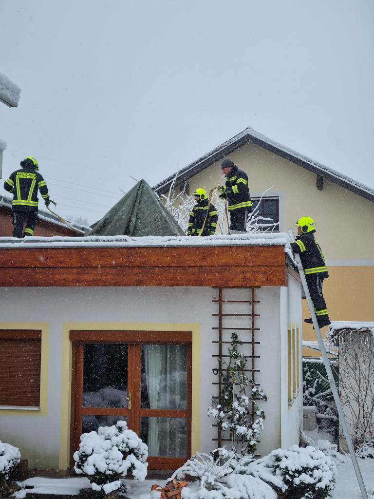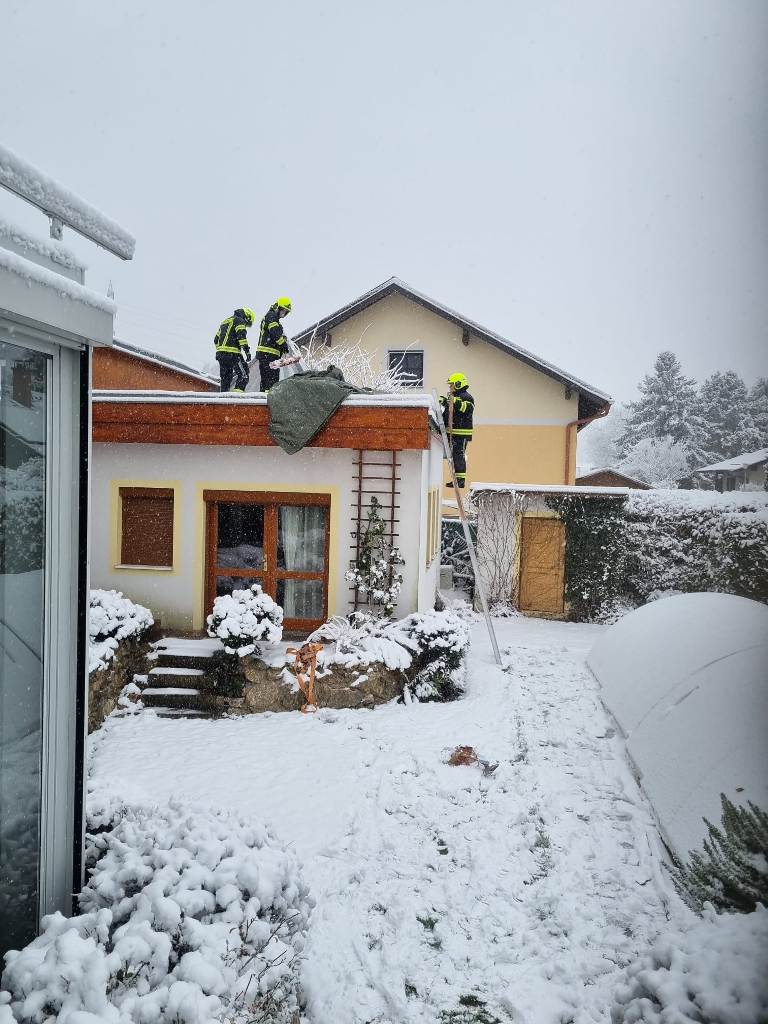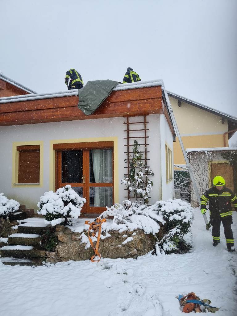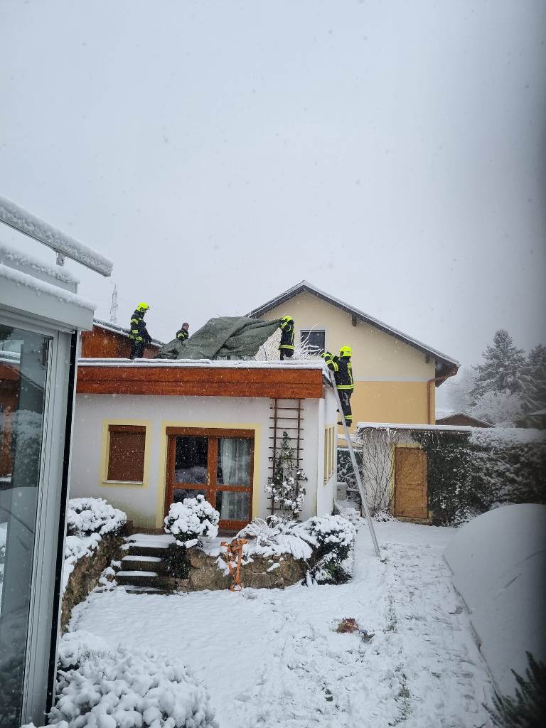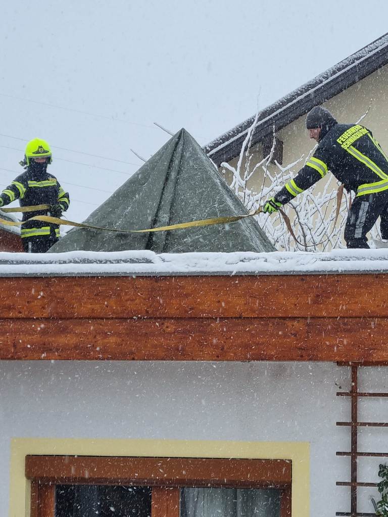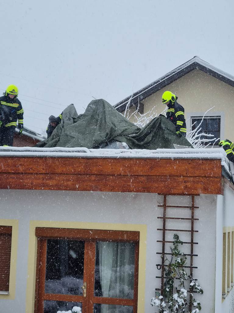 Die Kameraden der FF Schwarzau entfernten den Schnee und deckten die Glaskuppel provisorisch mit einer Plane ab.